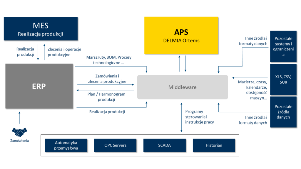 Ustalenie odpowiedniej architektury przetwarzania danych jest jednym z kluczowych zagadnień podczas przygotowania do pracy z zaawansowanymi systemami do planowania i harmonogramowania produkcji. APS działa w symbiozie z pozostałymi systemami informatycznymi w przedsiębiorstwie. Powyższy schemat przedstawia, jakie dane są wymieniane z poszczególnymi systemami, jakiego typu dane są potrzebne do tego, aby harmonogram produkcji mógł być przygotowany, a następnie, po przetworzeniu go i zoptymalizowaniu przez system APS, zwrócony i udostępniony systemom ERP czy MES do realizacji produkcji.