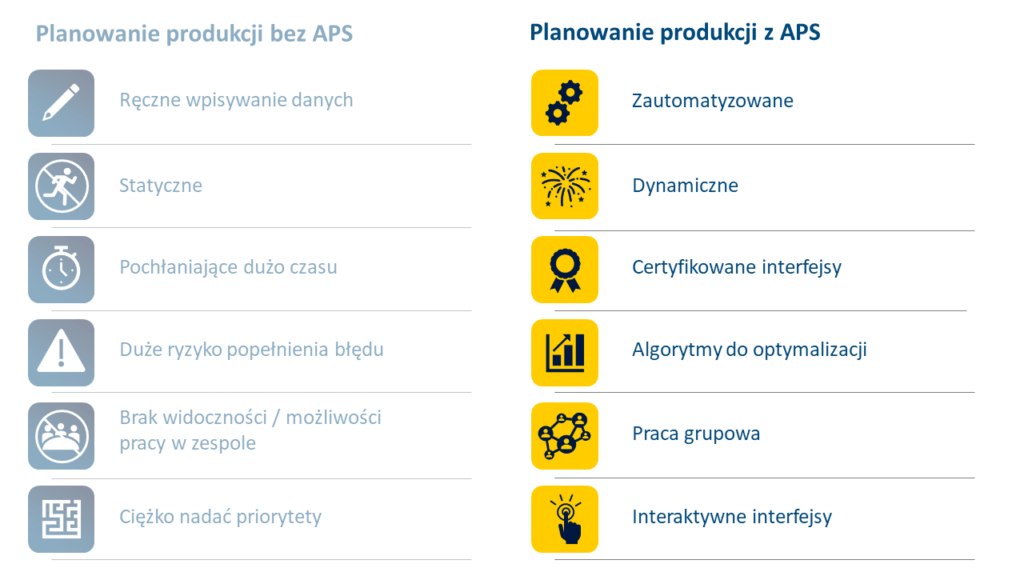 ERP to systemy do obsługi całego przedsiębiorstwa produkcyjnego i zarządzania jego zasobami, tj. zespołem pracowników, zasobami materiałowymi, finansami, umożliwiające optymalizację wykorzystania zasobów przedsiębiorstwa oraz zachodzących w nim procesów. Systemy APS stanowią zaś rozwinięcie systemów ERP, pozwalają wykonywać złożone operacje planistyczne i symulacyjne w celu optymalizacji produkcji. Umożliwiają tworzenie w krótkim czasie harmonogramu produkcji dla wielu wyrobów przy wsparciu zróżnicowanych procesów w firmie, uwzględniając ograniczone możliwości zasobów produkcyjnych. Oznacza to, że systemy APS są ściśle powiązane z ERP i współpracują z nimi, wymieniając dane i niezbędne informacje.